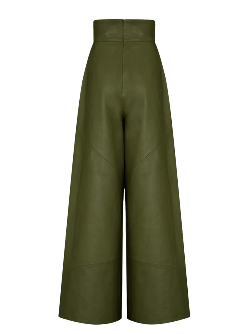 Women's wide-leg faux leather trousers, high-waisted, wide legs, belt and zip fastening
