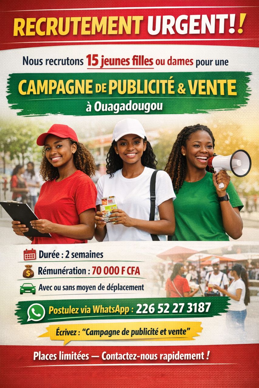 Nous recrutons 15 jeunes filles ou dames pour une campagne de publicité et de vente à Ouagadougou.