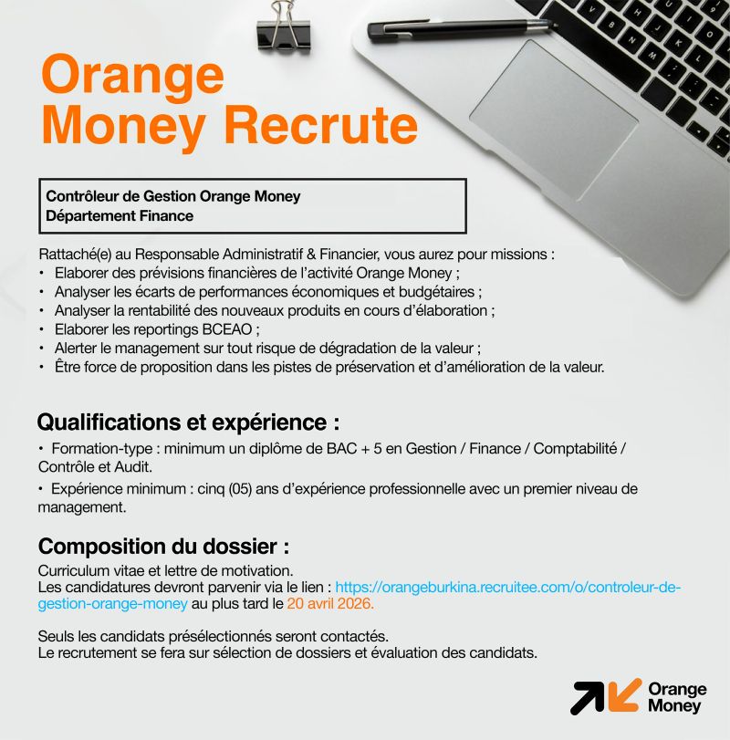 Vous avez une solide expertise en finance et souhaitez rejoindre un acteur majeur de la fintech en Afrique ? Orange Money Burkina Faso recherche son futur Contrรดleur de Gestion.