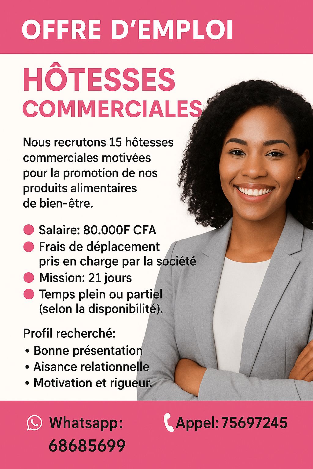 Offre d' emploi HÔTESSES COMMERCIALES Nous recrutons 15 hôtesses co