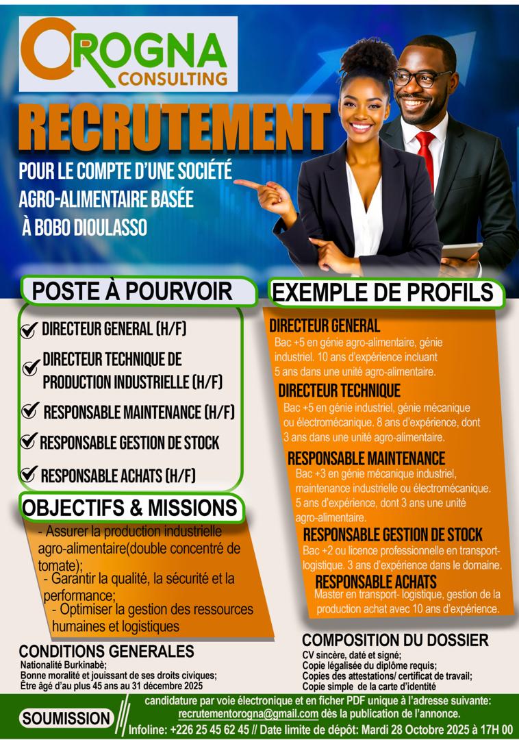Recrutement de 01 directeur général, un directeur technique de production industrielle (h/f), 01 responsable de la maintenance, responsable de gestion de stock, responsable achats.