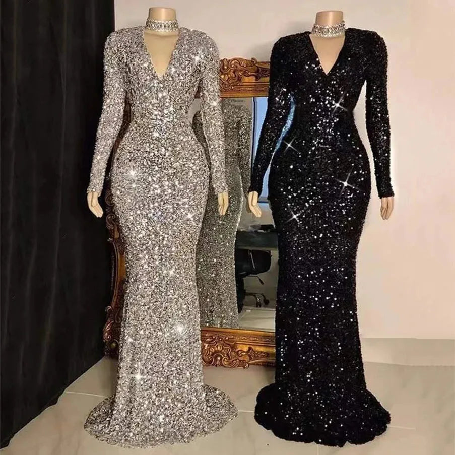 Robe à paillettes robe de soirée élégante col en V à manches long