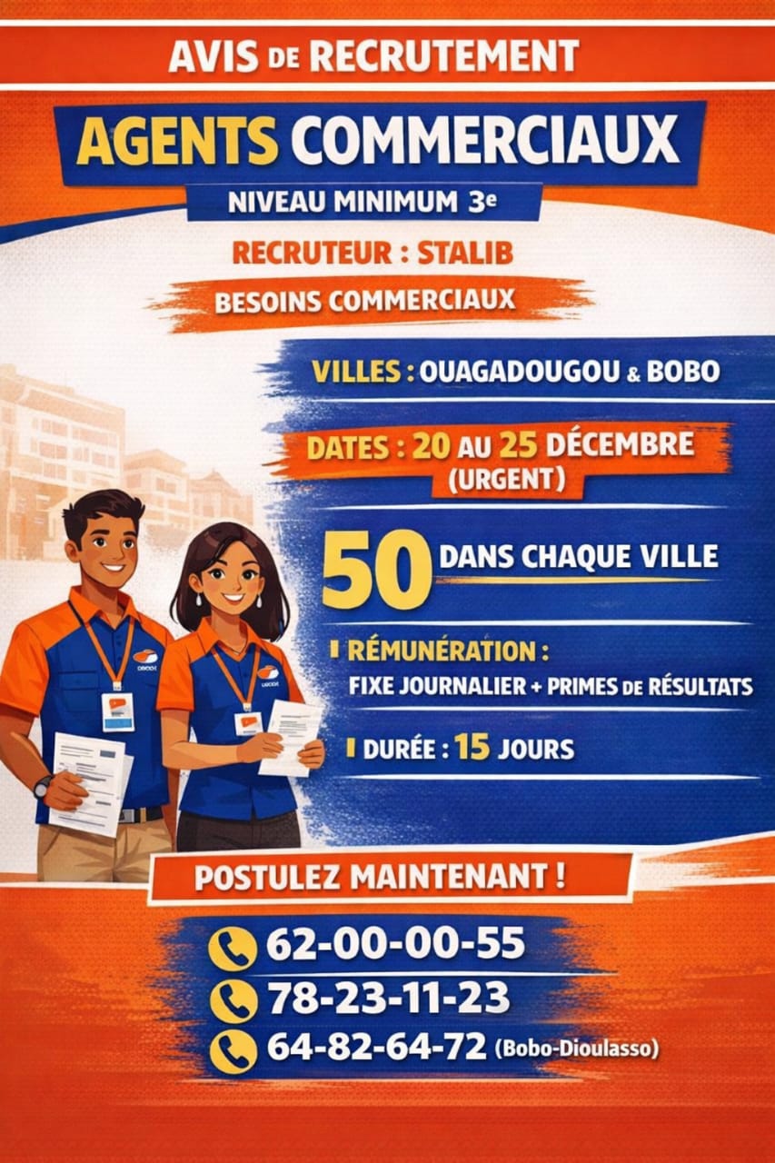 đ Nous recrutons 50 agents commerciaux par ville Ă Ouagadougou et Bobo-Dioulasso.