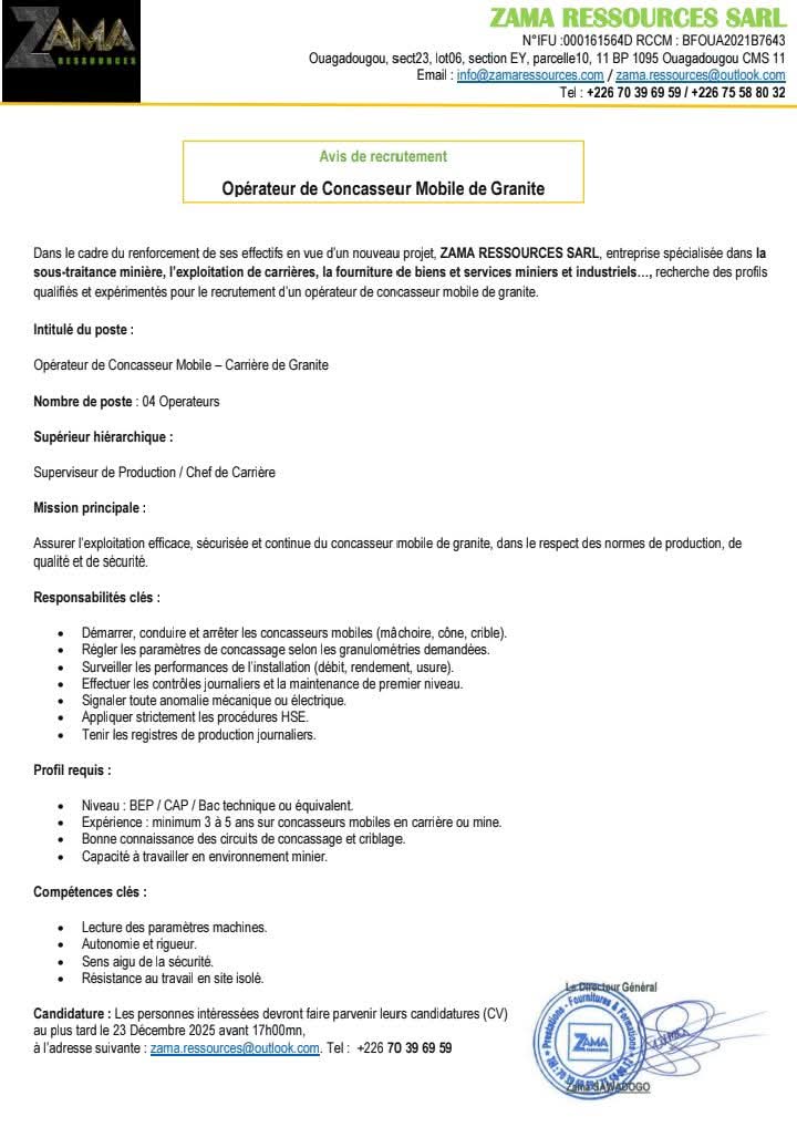 Dans le cadre du renforcement de ses effectifs en vue d'un nouveau projet, ZAMA RESSOURCES SARL, entreprise spécialisée dans la sous-traitance minière, l'exploitation de carrières, la fourniture de biens et services miniers et industriels..., recherche des profils qualifiés et expérimentés pour le recrutement d'un opérateur de concasseur mobile de granite.