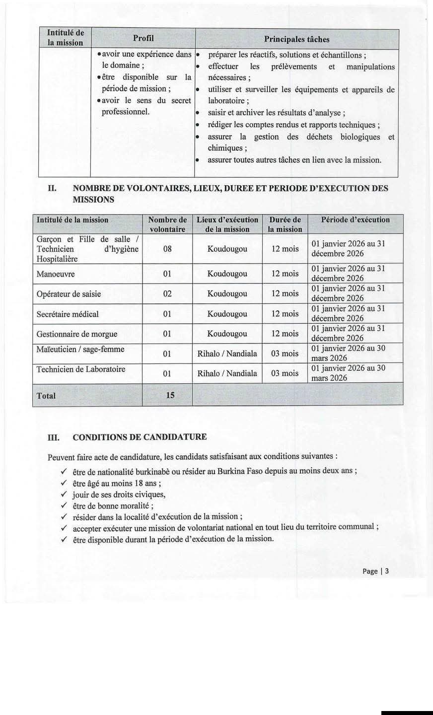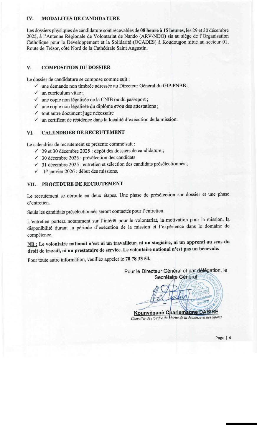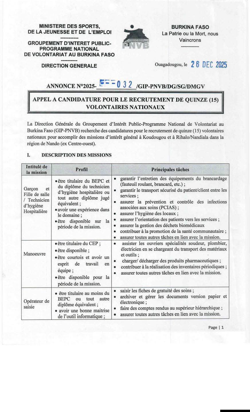 La Direction Gรฉnรฉrale du Groupement d'Intรฉrรชt Public-Programme National de Volontariat au Burkina Faso (GIP-PNVB) recherche des candidatures pour le recrutement de quinze (15) volontaires nationaux pour accomplir des missions d'intรฉrรชt gรฉnรฉral ร Koudougou et ร Rihalo/Nandiala dans la rรฉgion de Nando (ex Centre-ouest).