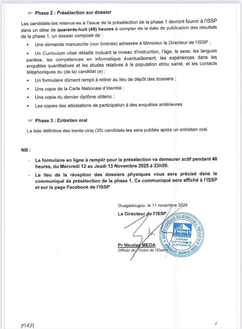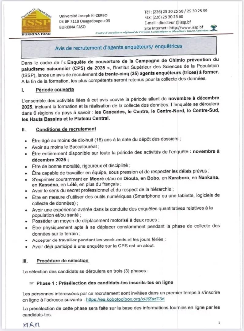 Dans le cadre de l'« Enquête de couverture de la Campagne de Chimio prévention du paludisme saisonnier (CPS) de 2025 », l'Institut Supérieur des Sciences de la Population (ISSP), lance un avis de recrutement de trente-cinq (35) agents enquêteurs (trices) à former.