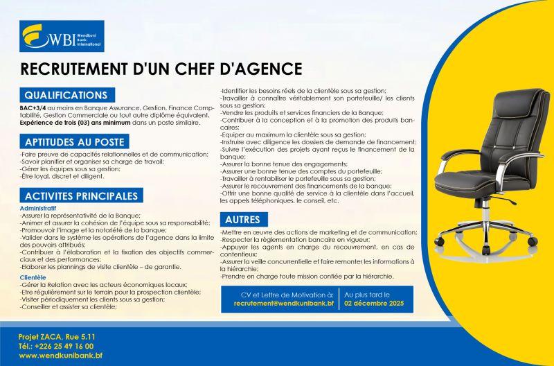 Recrutement d'un chef d'agence Pour WendKuni Bank International WBI